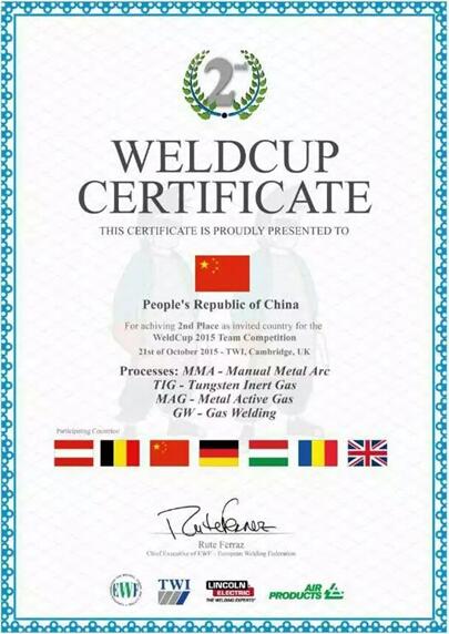 2015年10月21日,由欧洲焊接联合会主办、英国TWI(The Welding Institute)组织,奥地利、比利时、中国、德国、匈牙利、罗马尼亚和英国等国际焊接强国参加的技术交流会及焊接大赛在英国剑桥TWI总部落下帷幕,来自中国石油天然气集团公司的兰天宇、梁猛和来自中国船舶集团公司的李硕组成的中国参赛团在其中一位成员严重水土不服、身体状态不佳的情况下,奋力拼搏,过关斩将,取得与德国代表队并列团体第二名的良好成绩;同时,李硕被评为最佳TIG焊工。